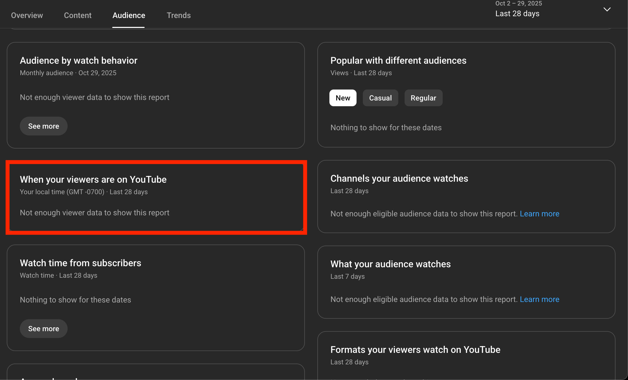 If you’re new to YouTube and don’t have access to these analytics yet, start by posting during the general ideal posting times outlined here, then come back to your analytics after a few weeks have passed.