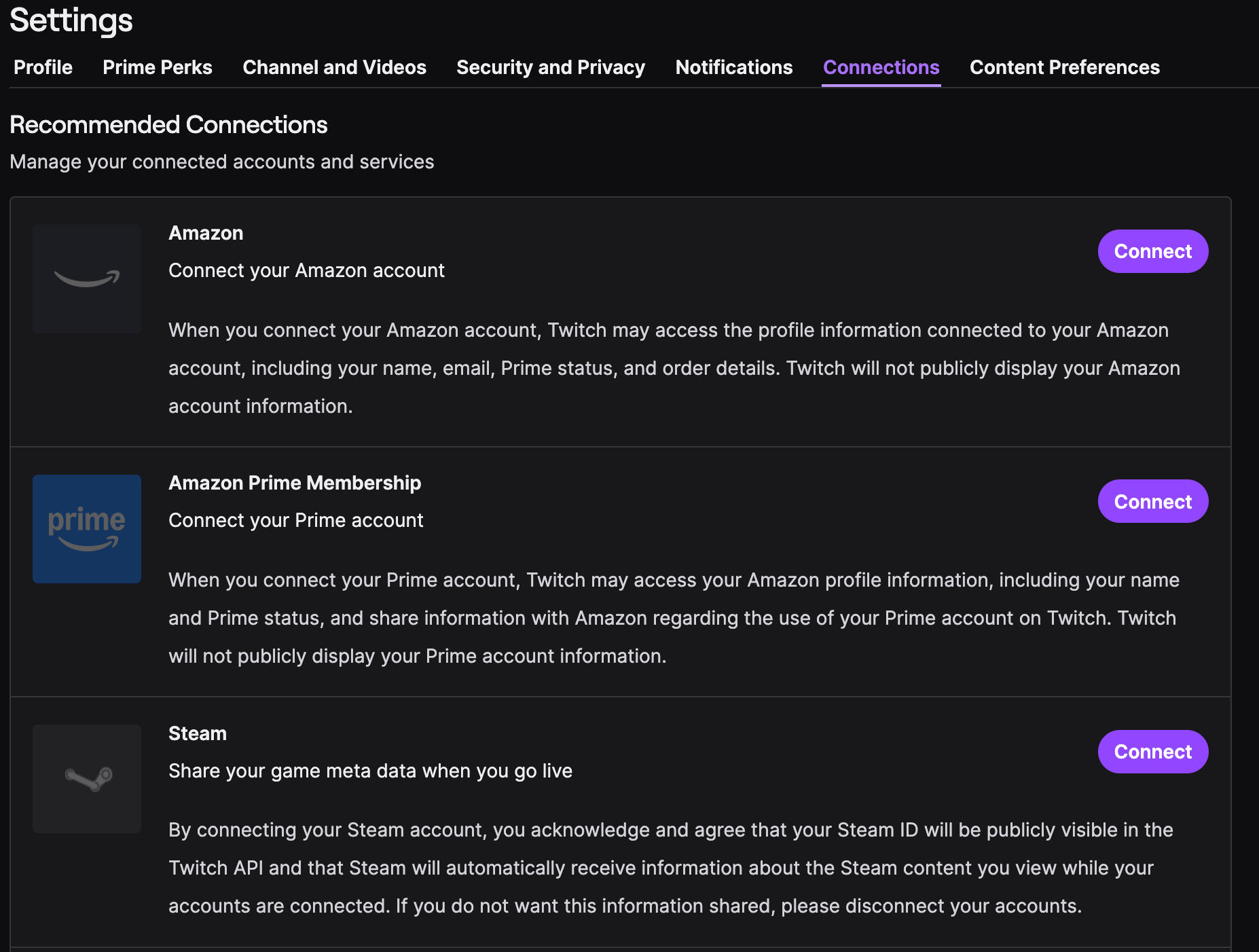 If you’ve linked any third party sites to your Twitch account, you can adjust the connections from here.