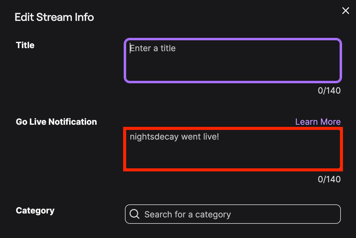 Under Go Live Notification, input your custom notification text to indicate that you’re creating a test stream.