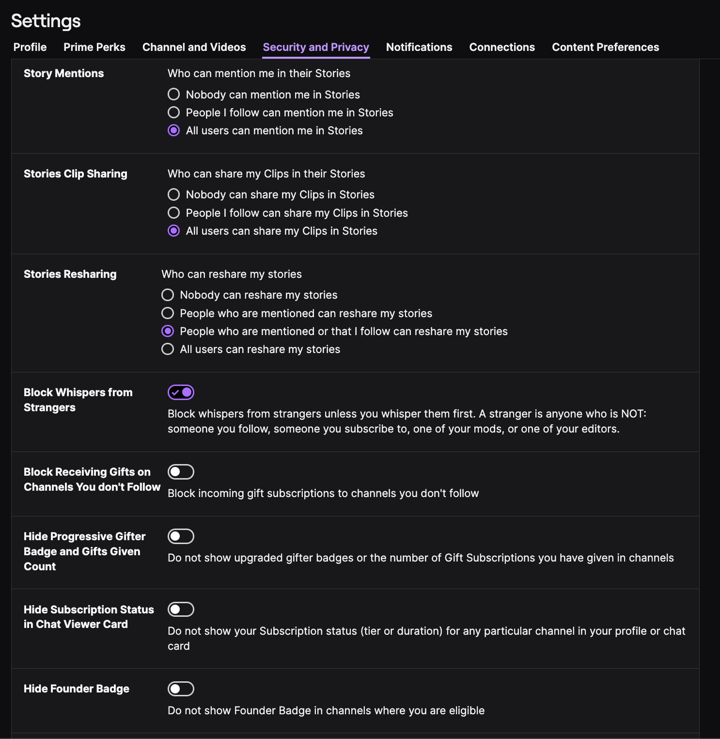You can also adjust what information Twitch shares about your account, and who can interact with you.