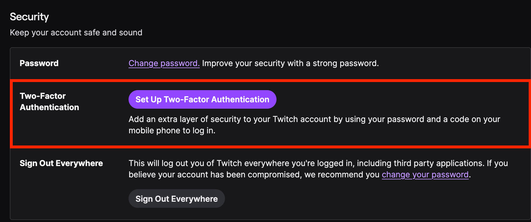 Like any other platform, Twitch offers two-factor authentication which you should definitely take advantage of as an added layer of security.
