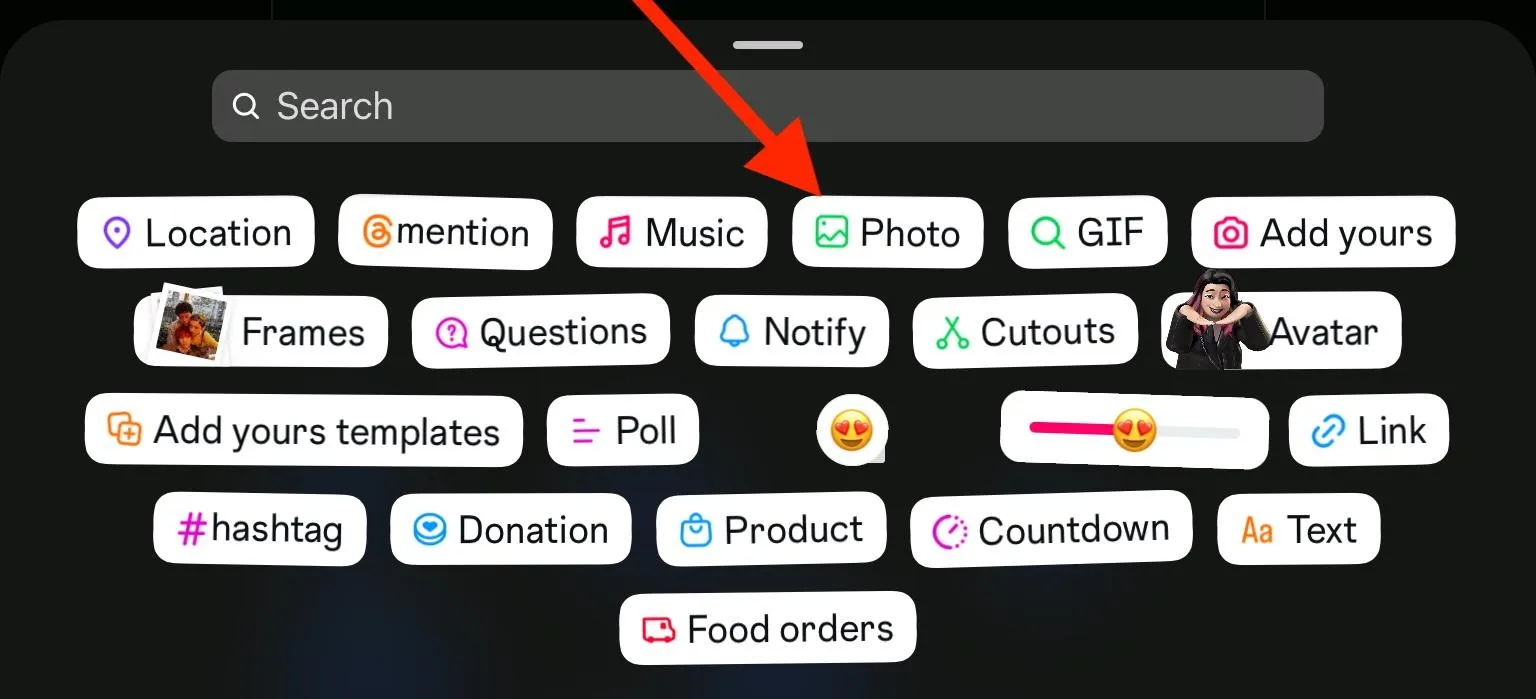Tap Photo and choose your image from the camera roll. Repeat as many times as needed. You can also add stickers, audio, and other edits from the Story creation screen.
