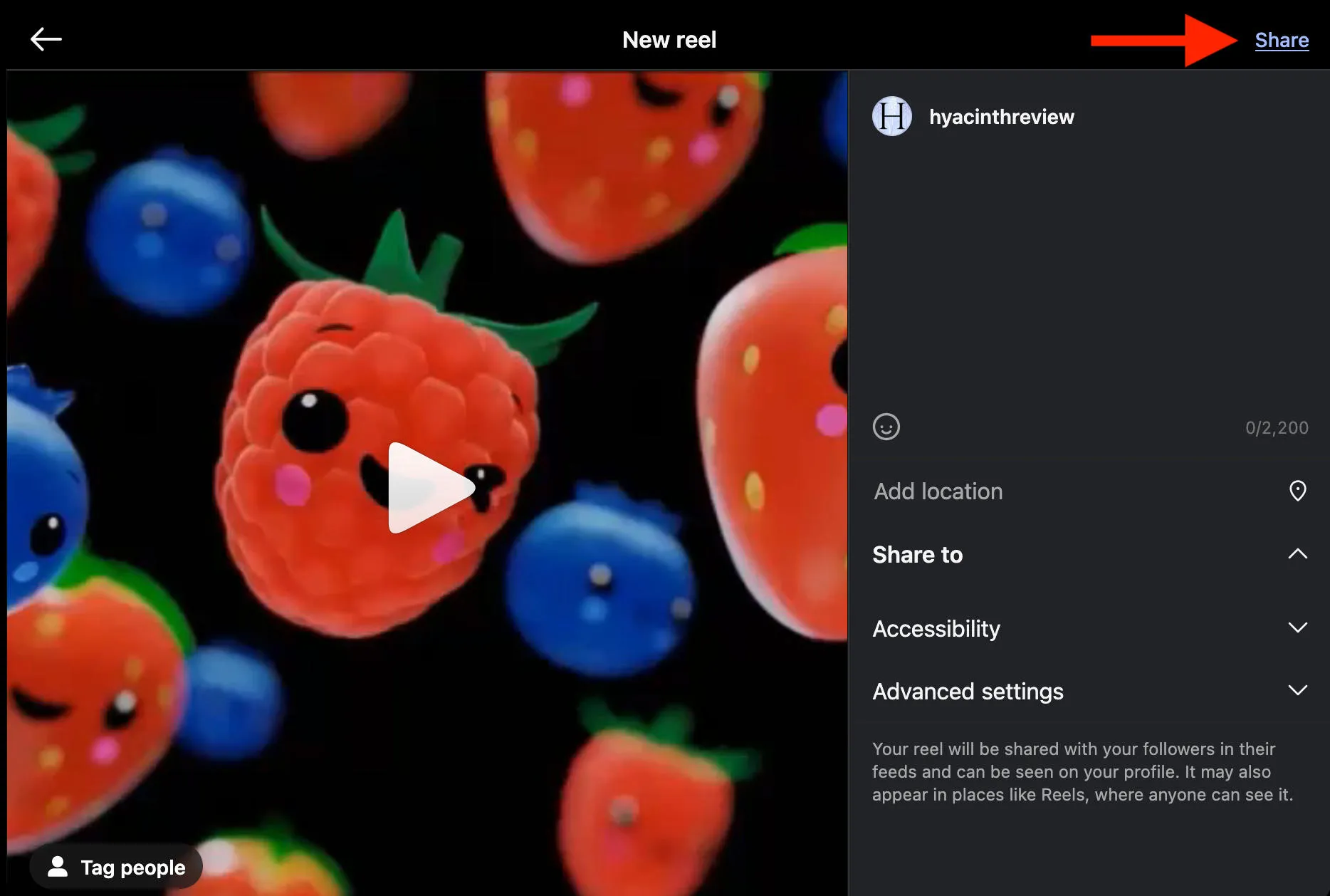 Add your caption, hashtags, location tags, and any other information you wish to include then click Share to post your Reel.