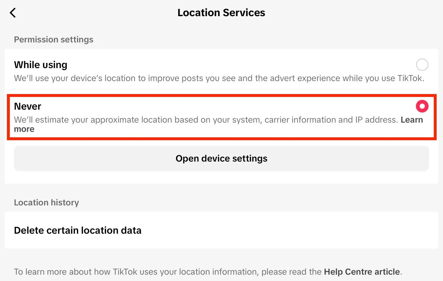 Tap Never if you prefer not to allow TikTok to know your specific location.