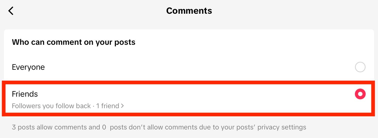 Change it to Friends. These are followers who you follow back, which means that the general public won’t be able to comment on your videos by default.