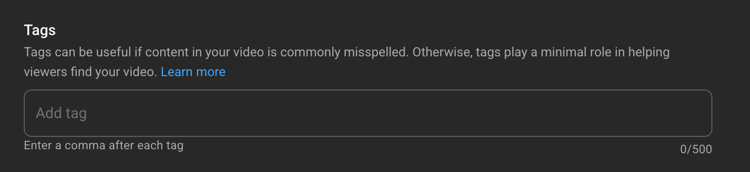 Without tags, both the YouTube search algorithm and viewers will have a harder time finding and engaging with your videos.