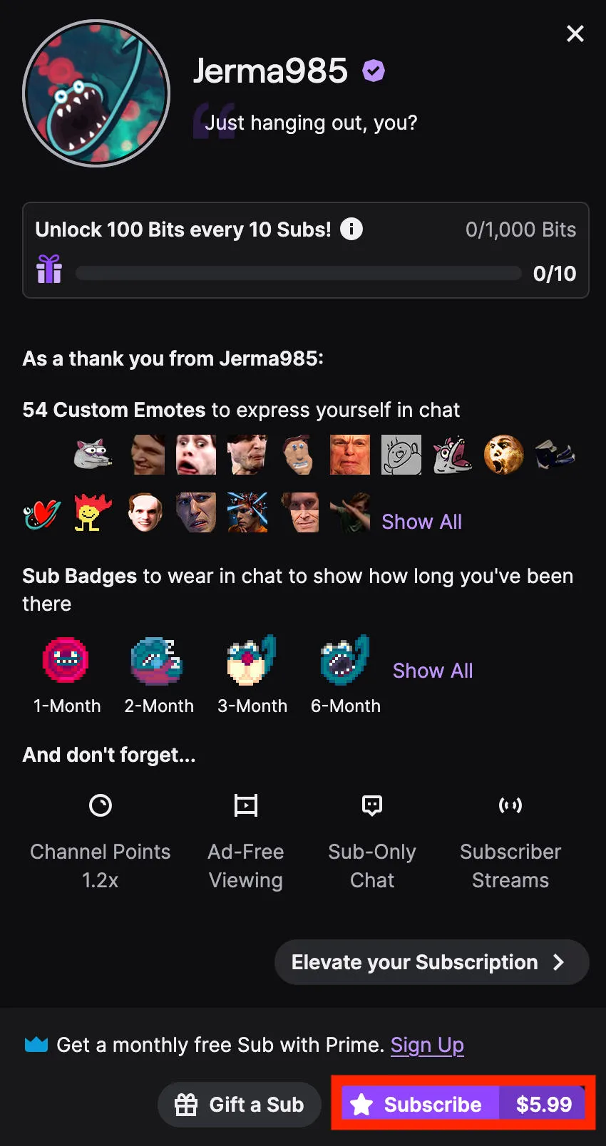 Subscribing to Twitch Prime unlocks a free channel subscription.