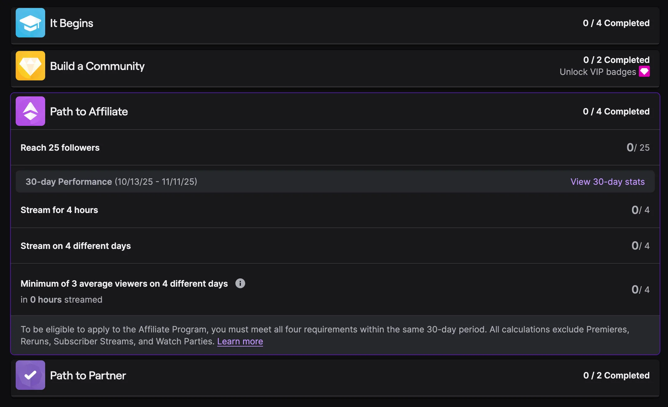 You can monitor your achievements and keep track of your requirements via your Twitch dashboard here.