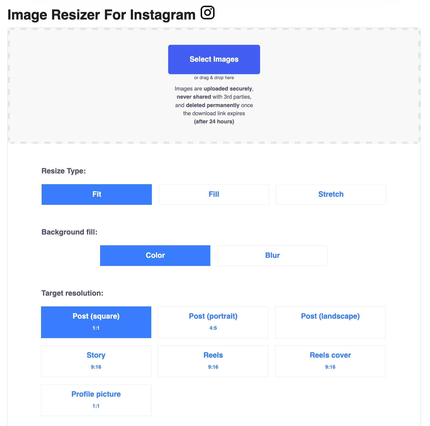 If you prefer a desktop tool, Simple Image Resizer offers an image resizer for Instagram that allows you to upload a photo and choose your target resolution depending on the content type.
