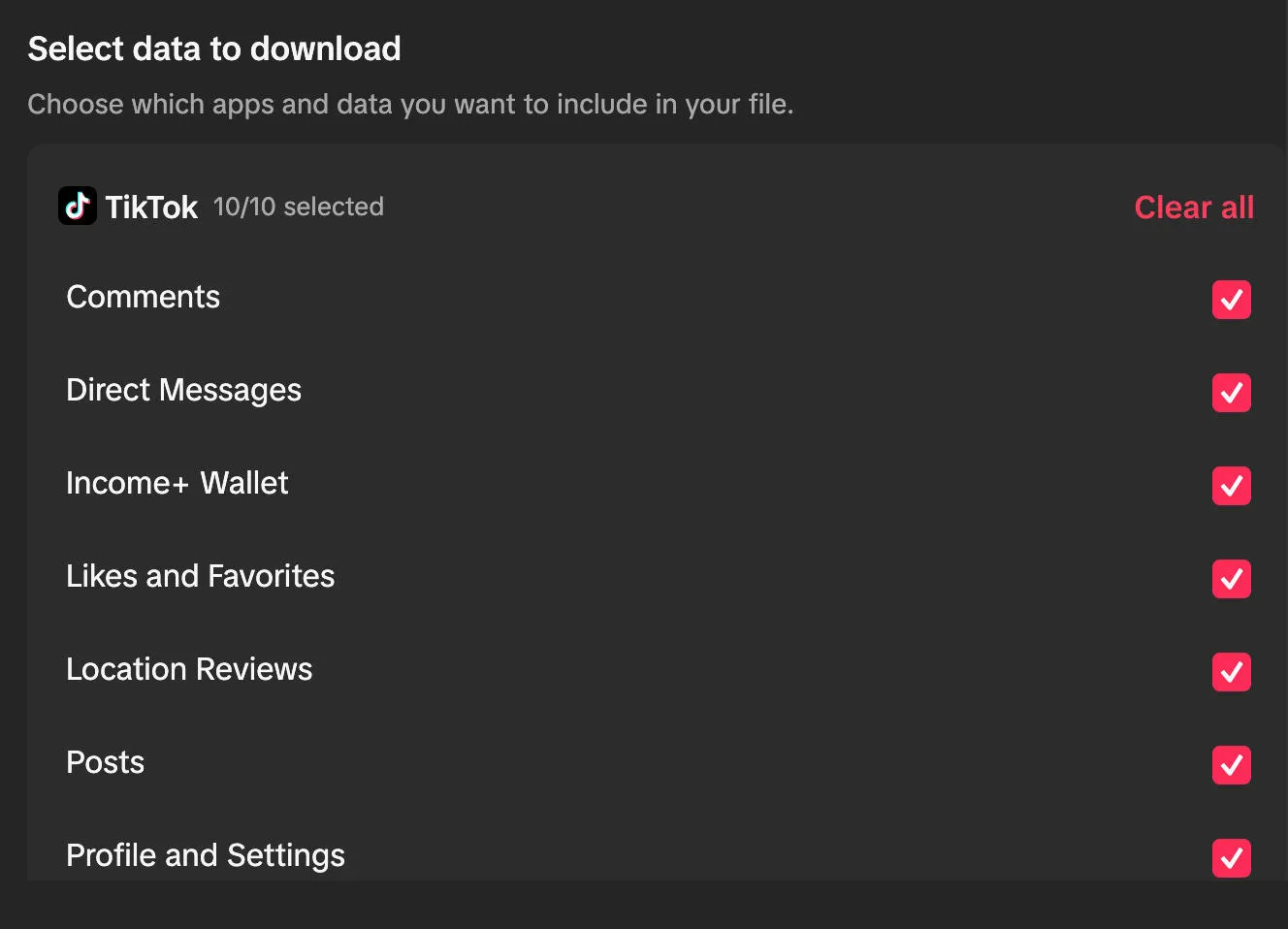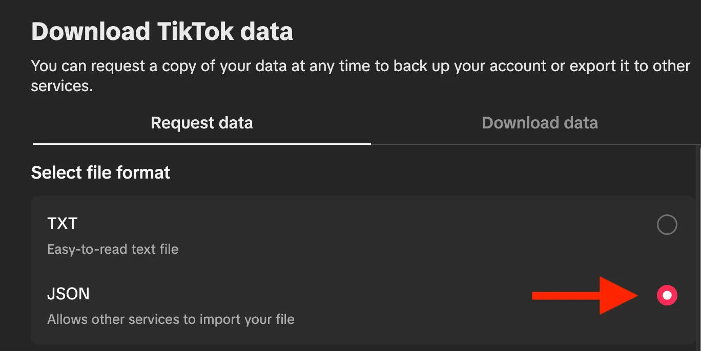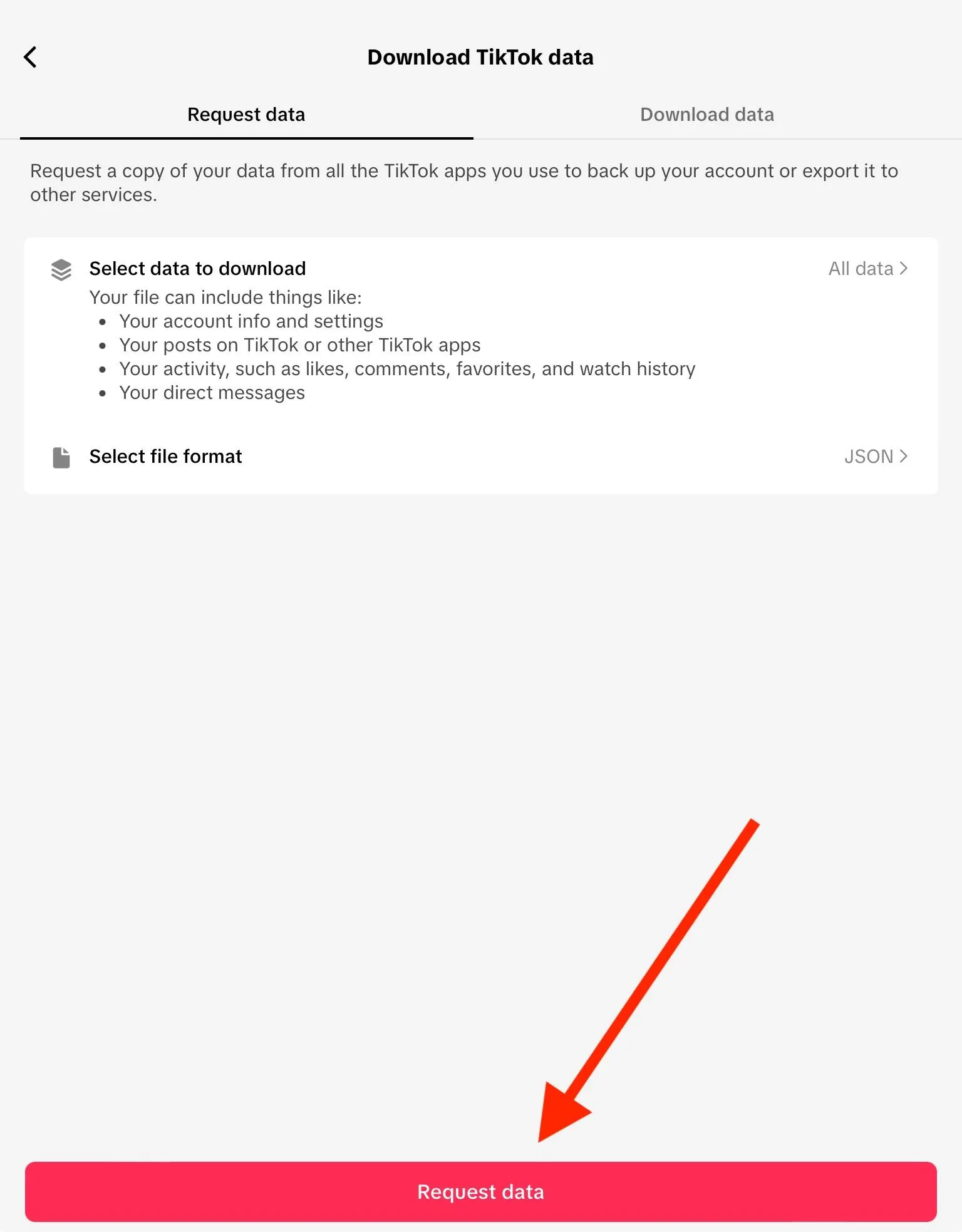 To get started, you'll need to request data directly from the TikTok app in file format. You can do this via the TikTok app or desktop website using the instructions below: