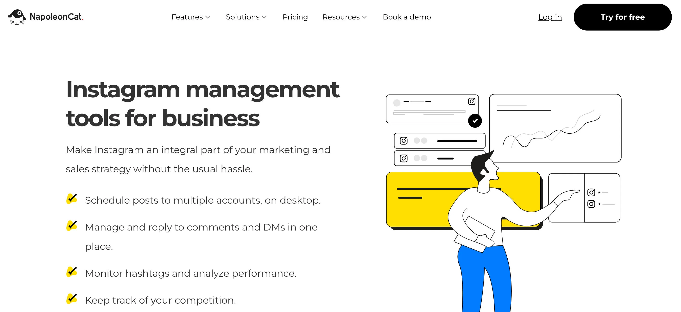What It Does: Allows you to schedule posts to multiple accounts via their desktop tool. You can also manage and reply to comments and DMs, as well as managing hashtags and analytics.