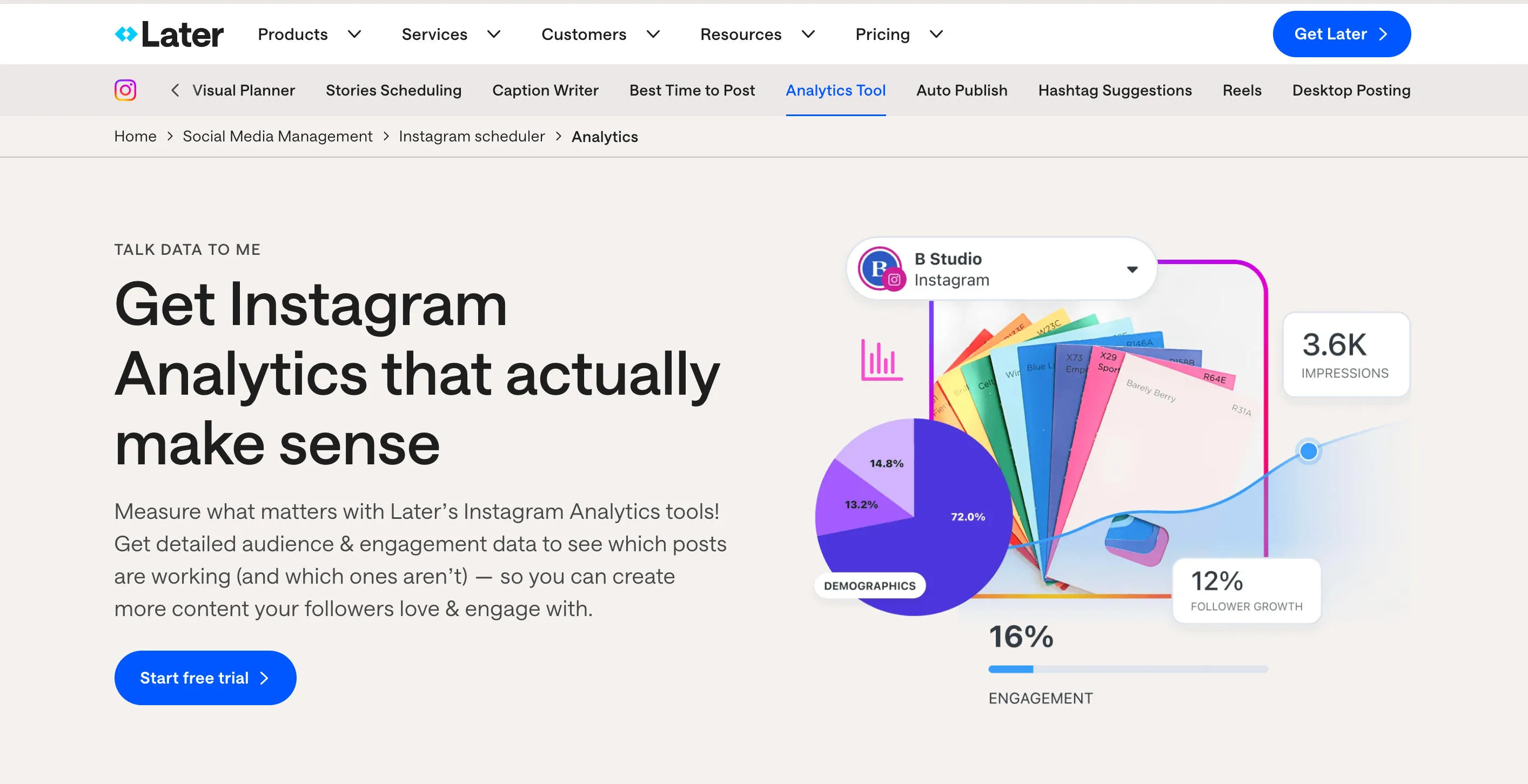 What It Does: Analytics including demographic data, top locations, languages spoken, follower growth and growth rate, and hashtag analytics, among other things. They also offer a Best Time To Post tool and analytics for a Link In Bio page.