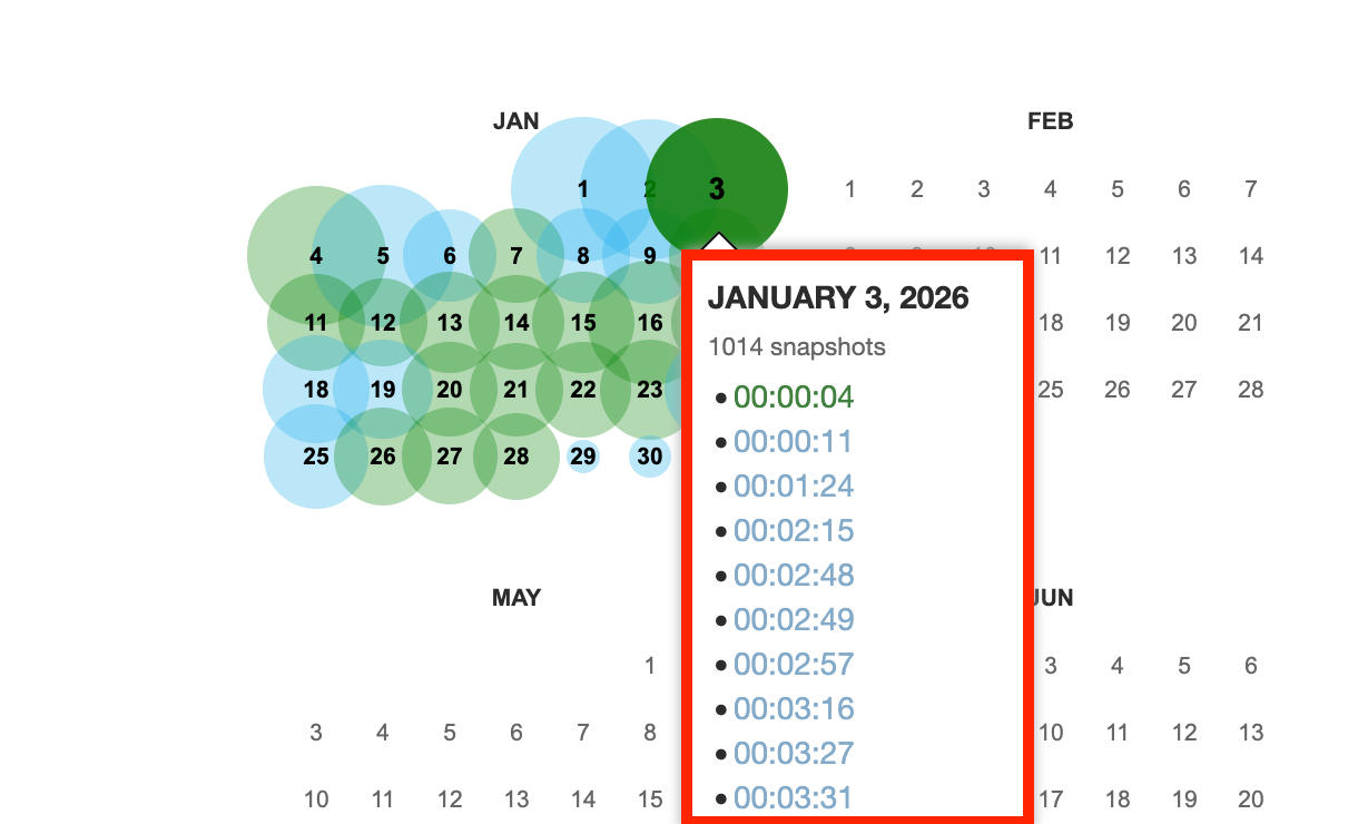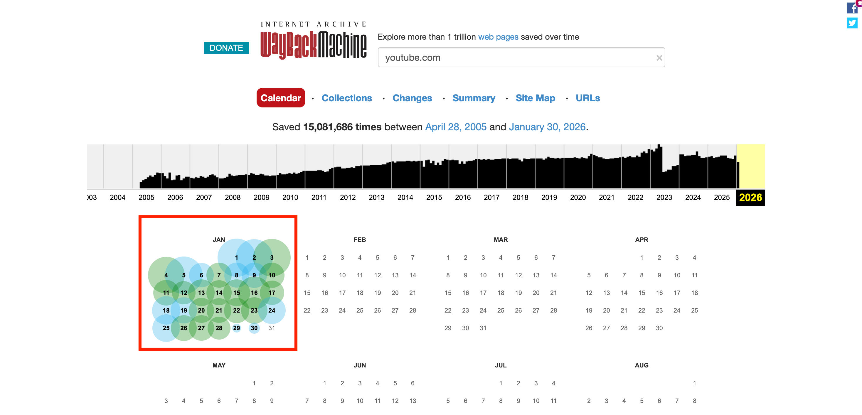 The calendar below the timeline will show instances where the page was captured using the Wayback Machine tool.
