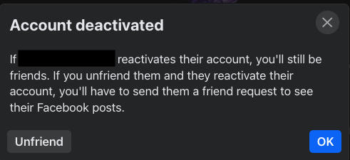 You will receive a popup stating that the account has been deactivated, deleted, or removed.