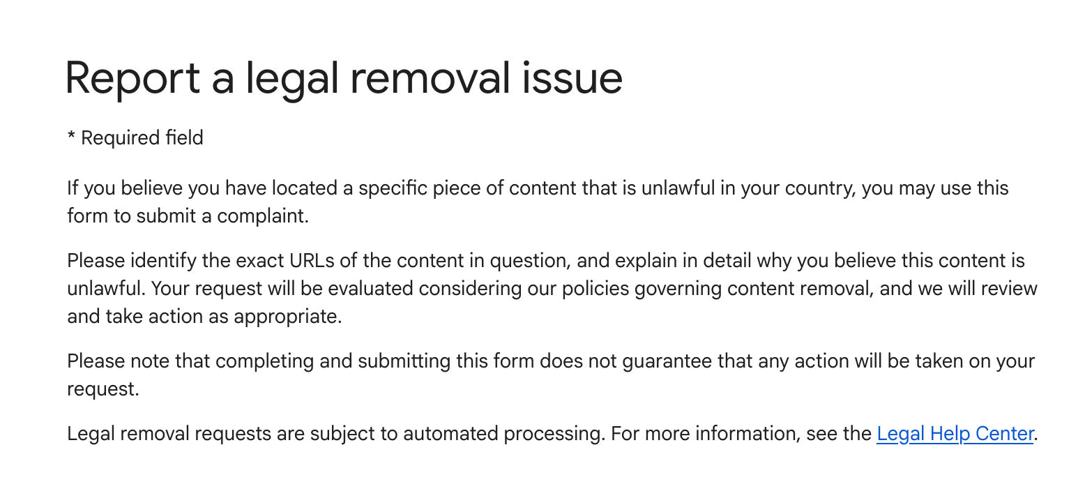 You’ll be redirected to Google’s contact page where you can input additional details for their legal team to look into.